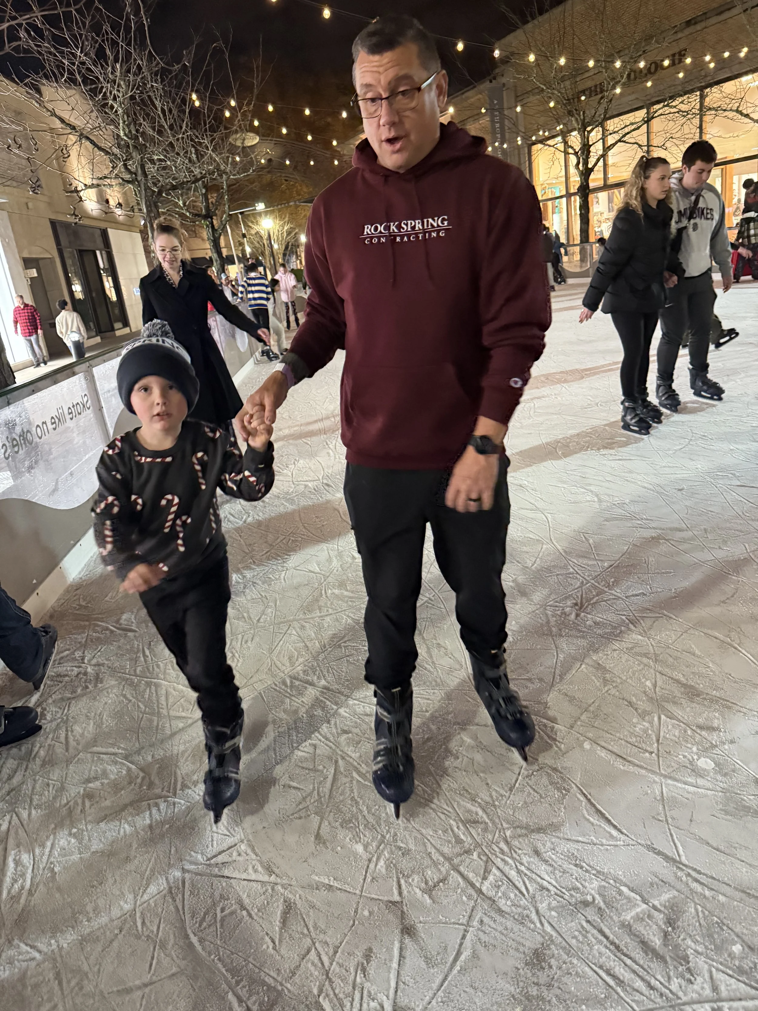 We arrived ready for a fun night—tummies filled with chocolate chip pancakes and milk, snow* fluttering in the sky, a perfectly lit rink… with every skating walker already rented (of course!).